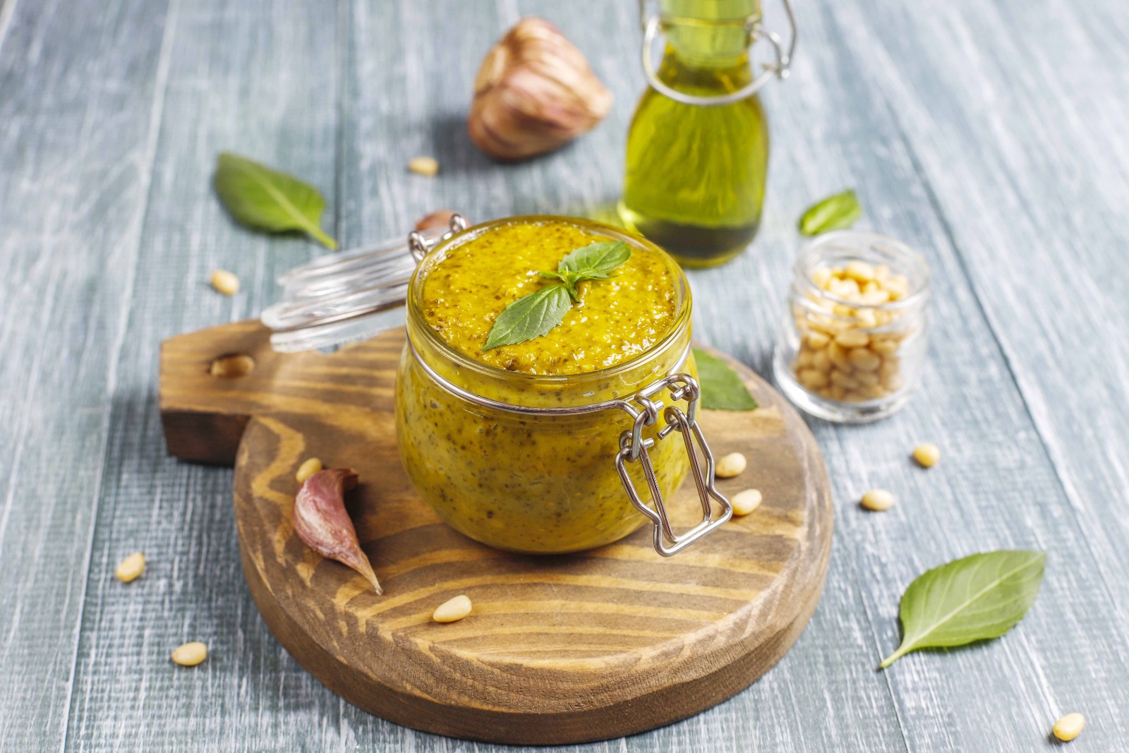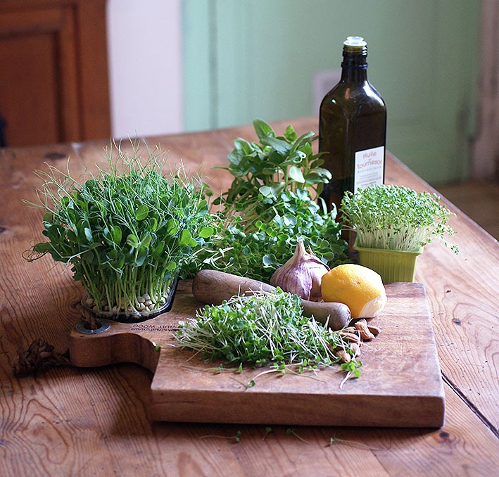 Cresson alénois, roquette, chou, moutarde, radis… Les pestos d'herbes se créent à l'infini. Le petit plus dans l’utilisation de micro pousses pour la préparation de pestos (par rapport aux feuilles de plantes adultes), c’est leur extrême concentration en arômes et nutriments. Pour Benoit, cultivateur de micro végétaux dans le sud-ouest, excepté pour les herbes aromatiques au goût prononcé comme le basilic, mieux vaut préférer une huile végétale plus neutre que l’huile d’olive qui a tendance à dénaturer et amener de l’amertume. Il conseille le colza par exemple. Les pignons ou les noisettes apporteront quant à eux texture et acides aminés.