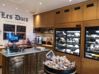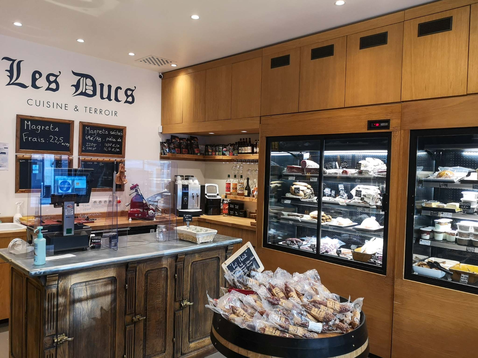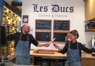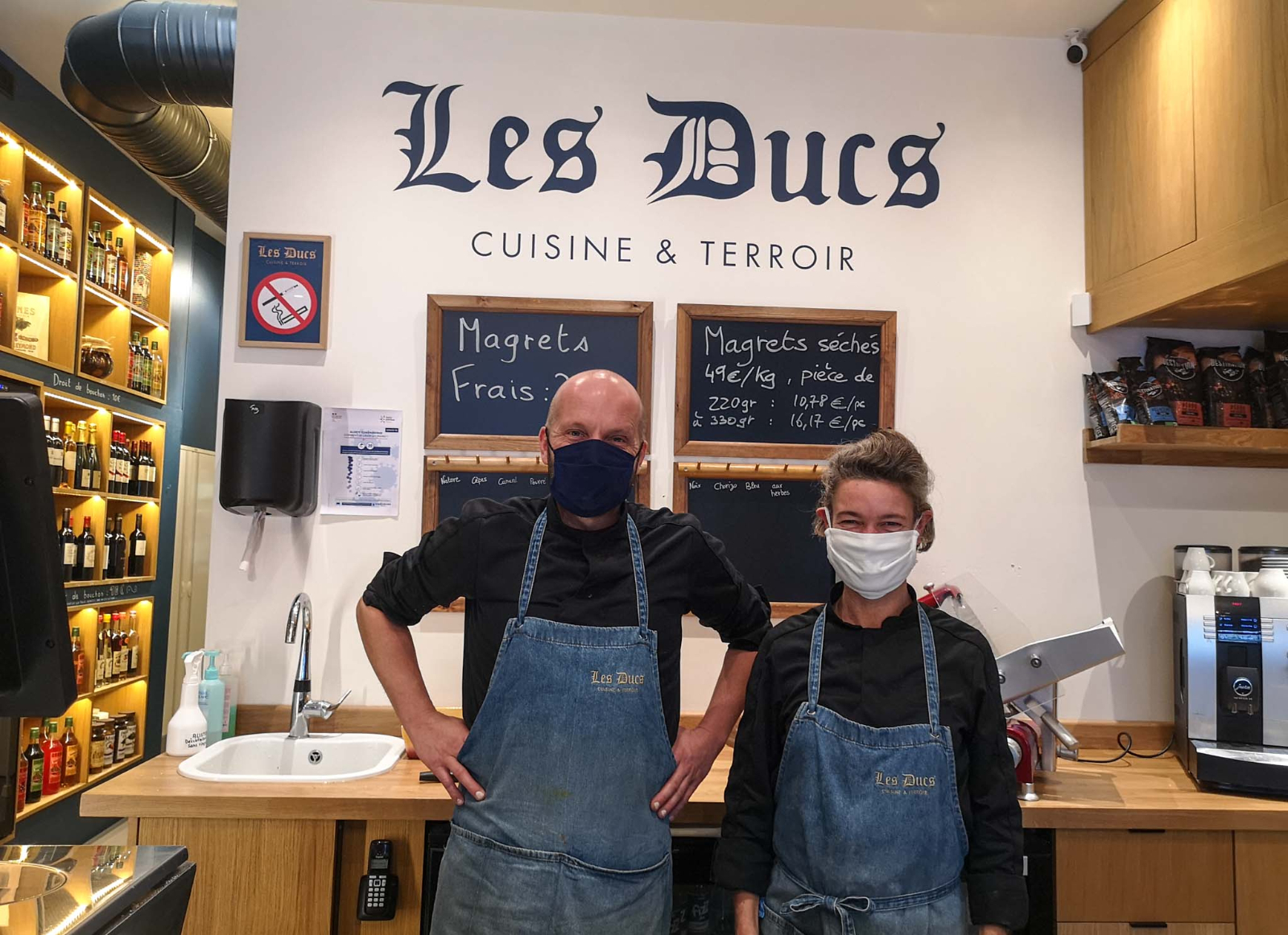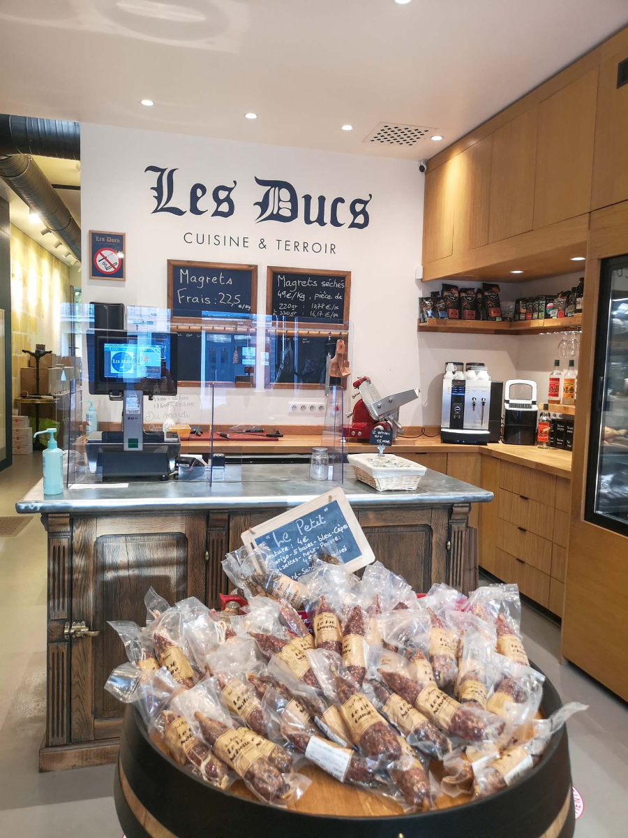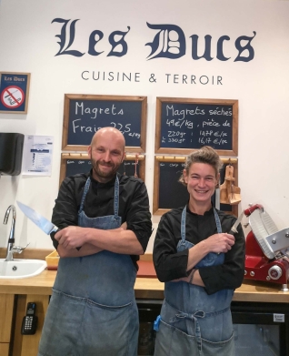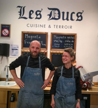 La devanture soignée, les sapins bientôt posés…la charcuterie Les Ducs affiche fièrement ses lettres dorées. Une fois la porte poussée, Sandrine & Frédéric nous accueillent les yeux rieurs, le sourire aux lèvres...même masqué.