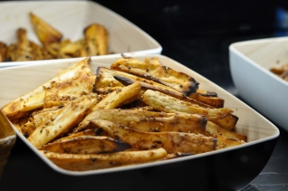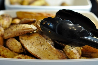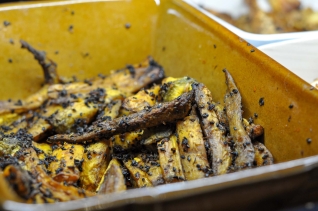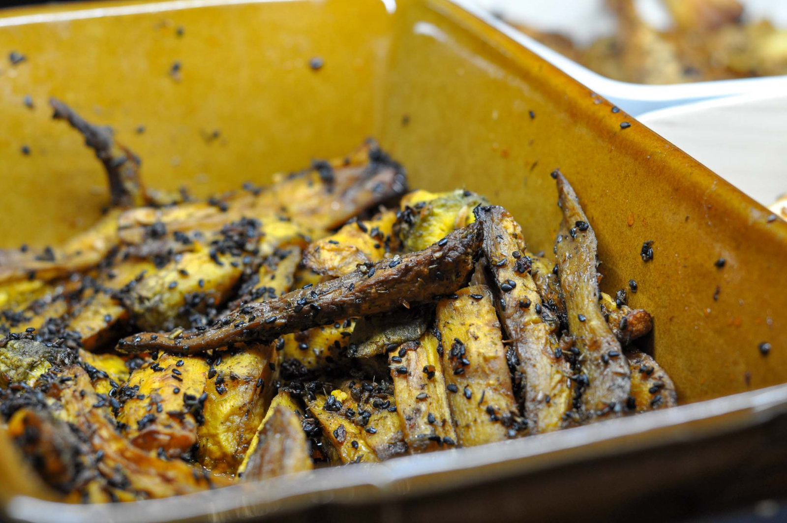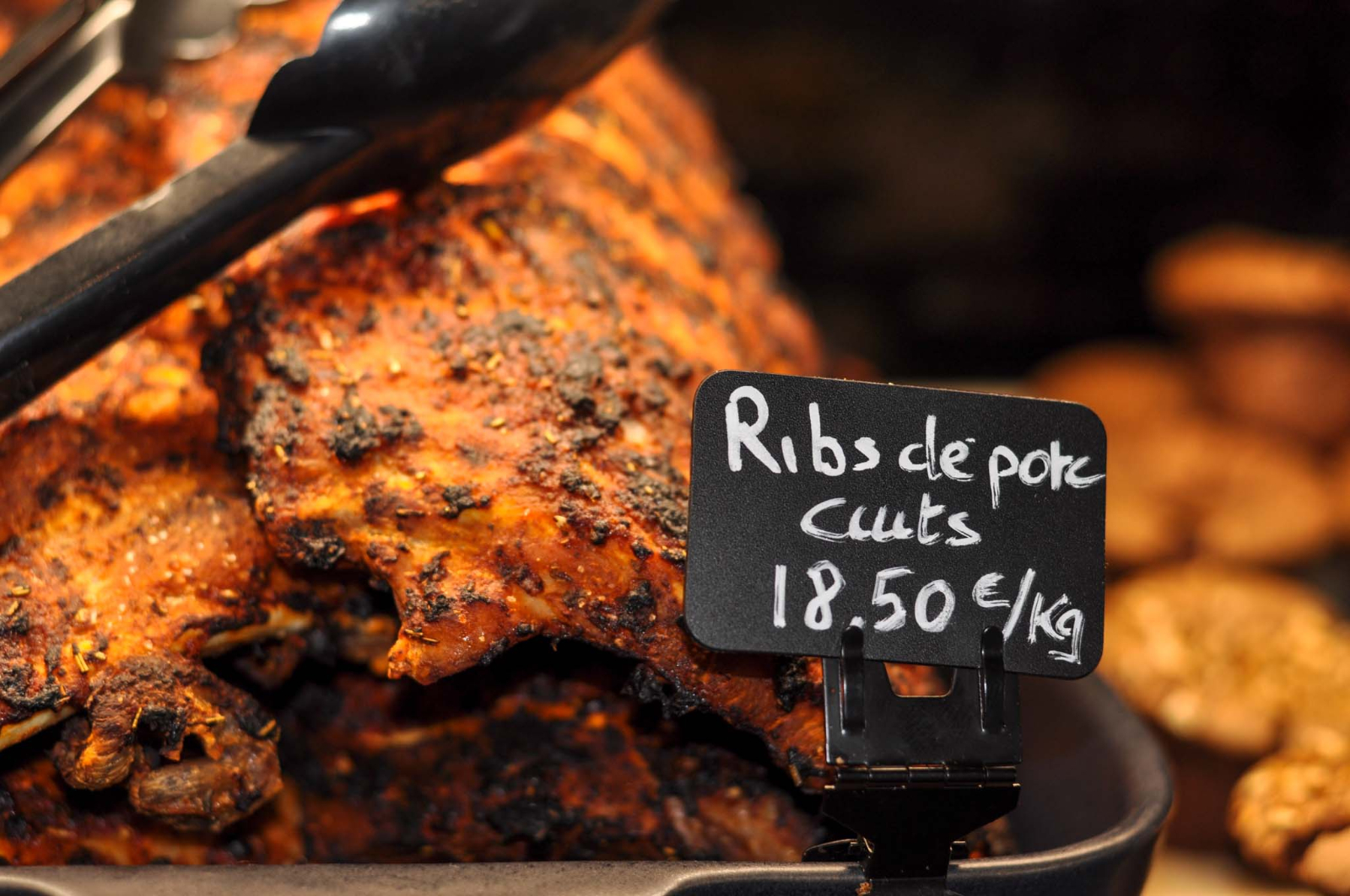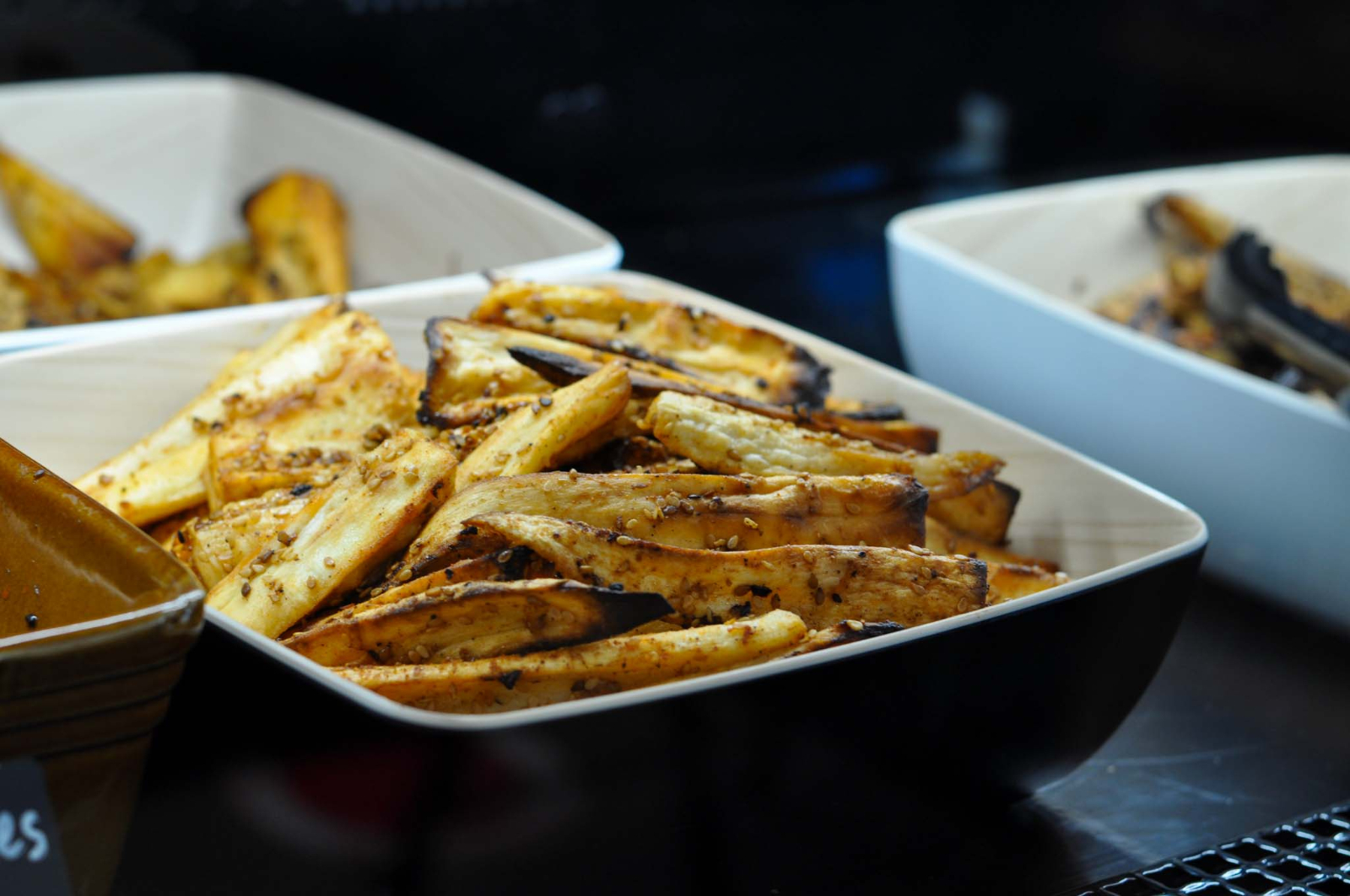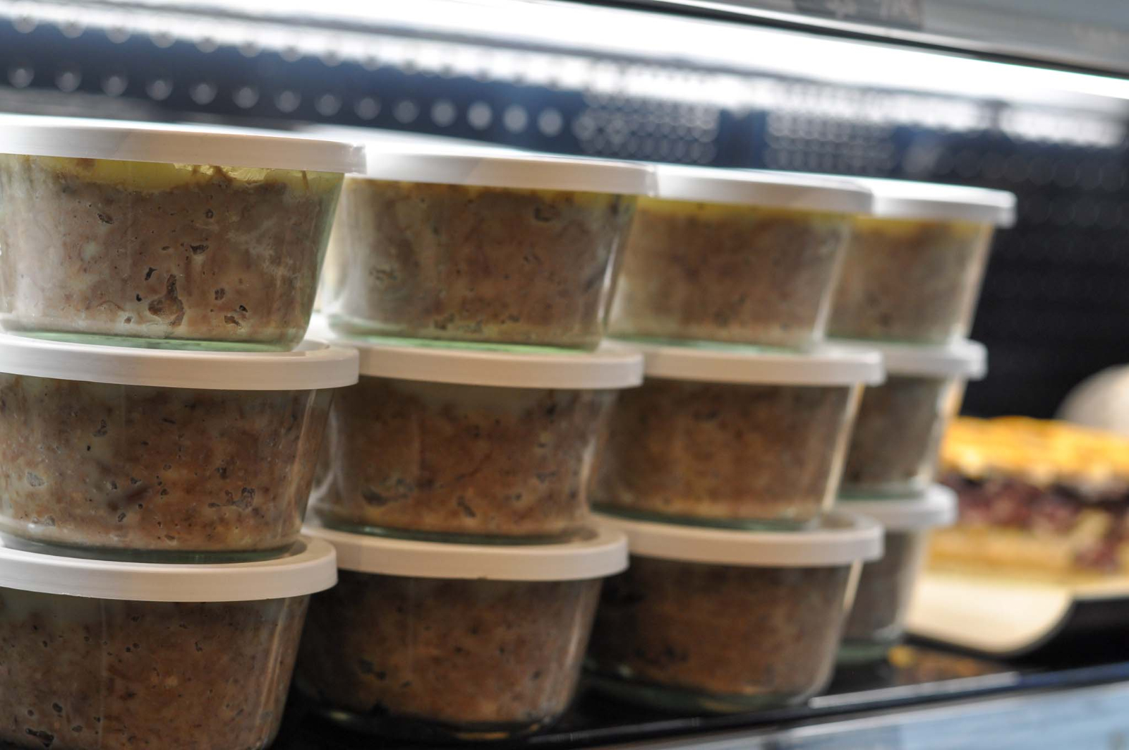 Côté légumes, on observe derrière la vitrine des carottes jaunes, du panais, du chou-fleur au curcuma ou encore des pommes de terre rôties à la graisse de canard. Frédéric précise : « On vend aussi du persil tubéreux, on dirait le nom d’une maladie mais c’est très bon (rires) ». Il ajoute : « Cette semaine j’essaie une nouvelle pomme de terre, la Trésor, rôtie au four. Avant, on achetait les légumes bruts. Maintenant on les achète chez Maison Trias prêts à cuire. On gagne en temps d’épluchage et en volume de déchets ».