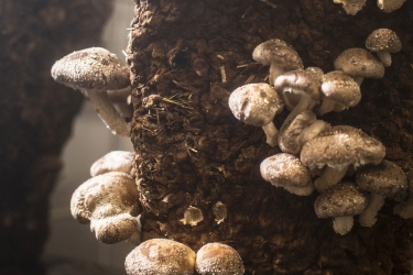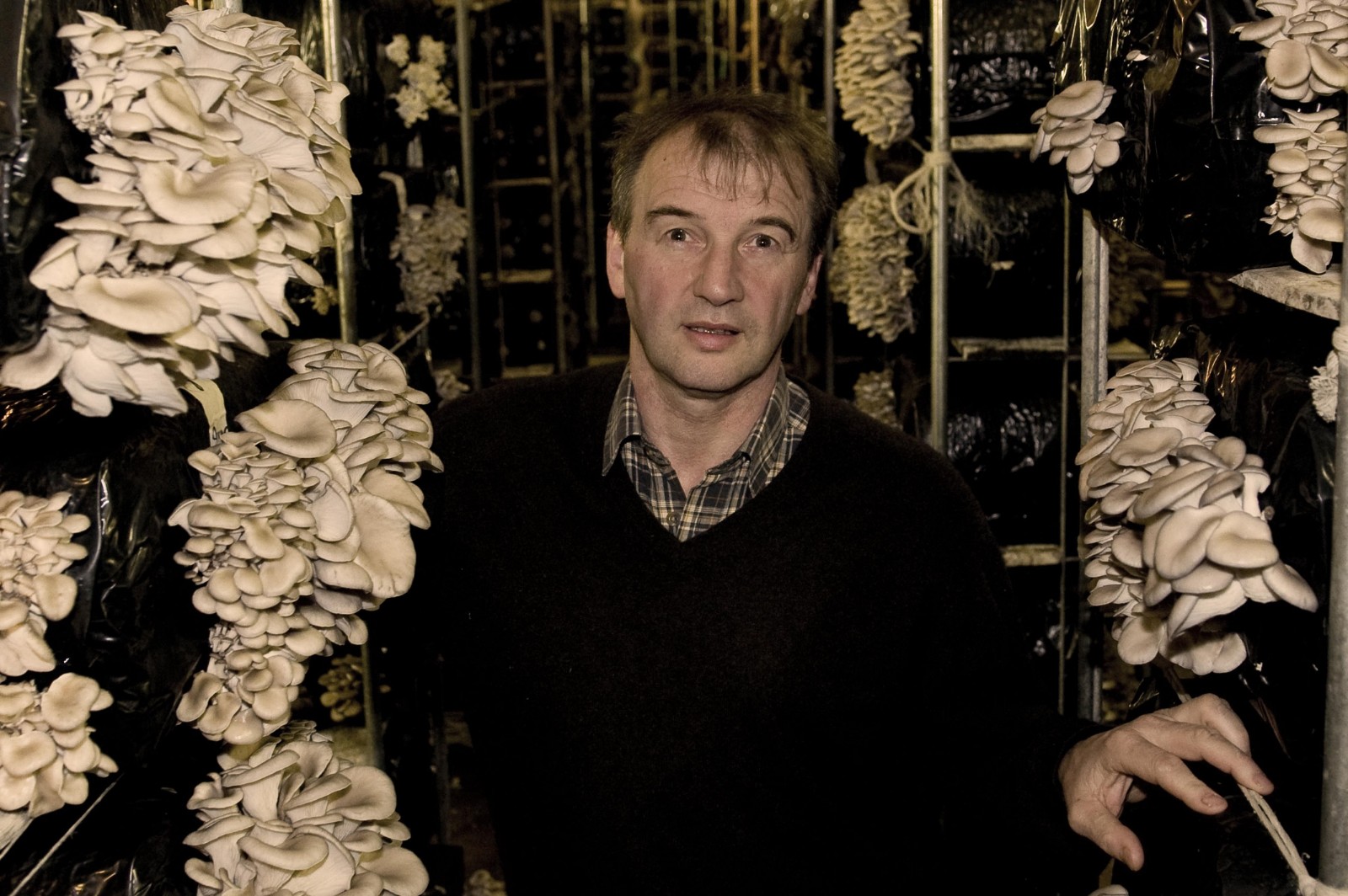 Fils d'agriculteur, notre cultivateur s'est lancé dans le champignon pour maintenir l'activité de la ferme paternelle qu'il a décidé de perpétuer en 1984 aux côtés de son frère. Depuis, ce sont 100 tonnes de Pleurotes et 25 de Shiitakes, cousin asiatique du cèpe, qui sortent chaque année de ses ateliers. Des ateliers qui sentent bon les bois, où les champignons percent les baluchons noirs pour voir le jour. Bertrand et son équipe fournissent ces comestibles toute l'année, pour autant il affirme : " Le champignon est fantaisiste, il fait ce qu’il veut. Il y a les influences lunaires, le baromètre. On sait qu’il pousse en automne, alors on fabrique l’automne ". Tout en arpentant les bâtiments ventilés et humidifiés il ajoute : " L’ennemi du champignon, c’est le champignon, la moisissure. Notre secret ? La présence, l’observation, la propreté ".